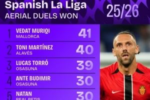 上一篇: 西甲地面拼抢成功次数排行:维尼修斯45次第二 姆巴佩40次第七 下一篇: 西甲争顶成功次数排行:赫伊森21次位居第八